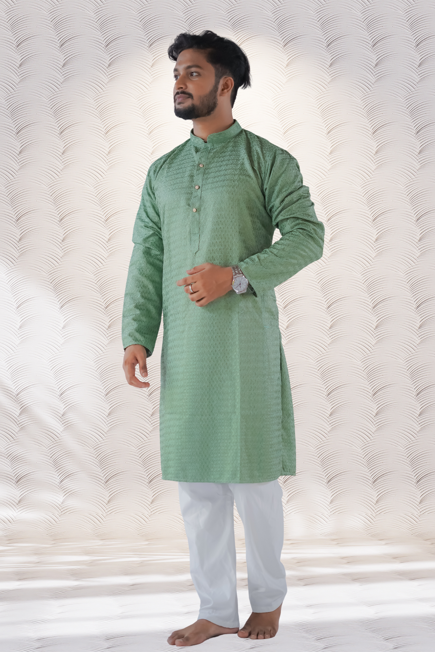 Description -Threadwork kurta in olive green ethnic wear set, crafted from premium rayon fabric. Designed for men who love comfort with style, this kurta pajama set is a timeless outfit for weddings, festivals, and special occasions.